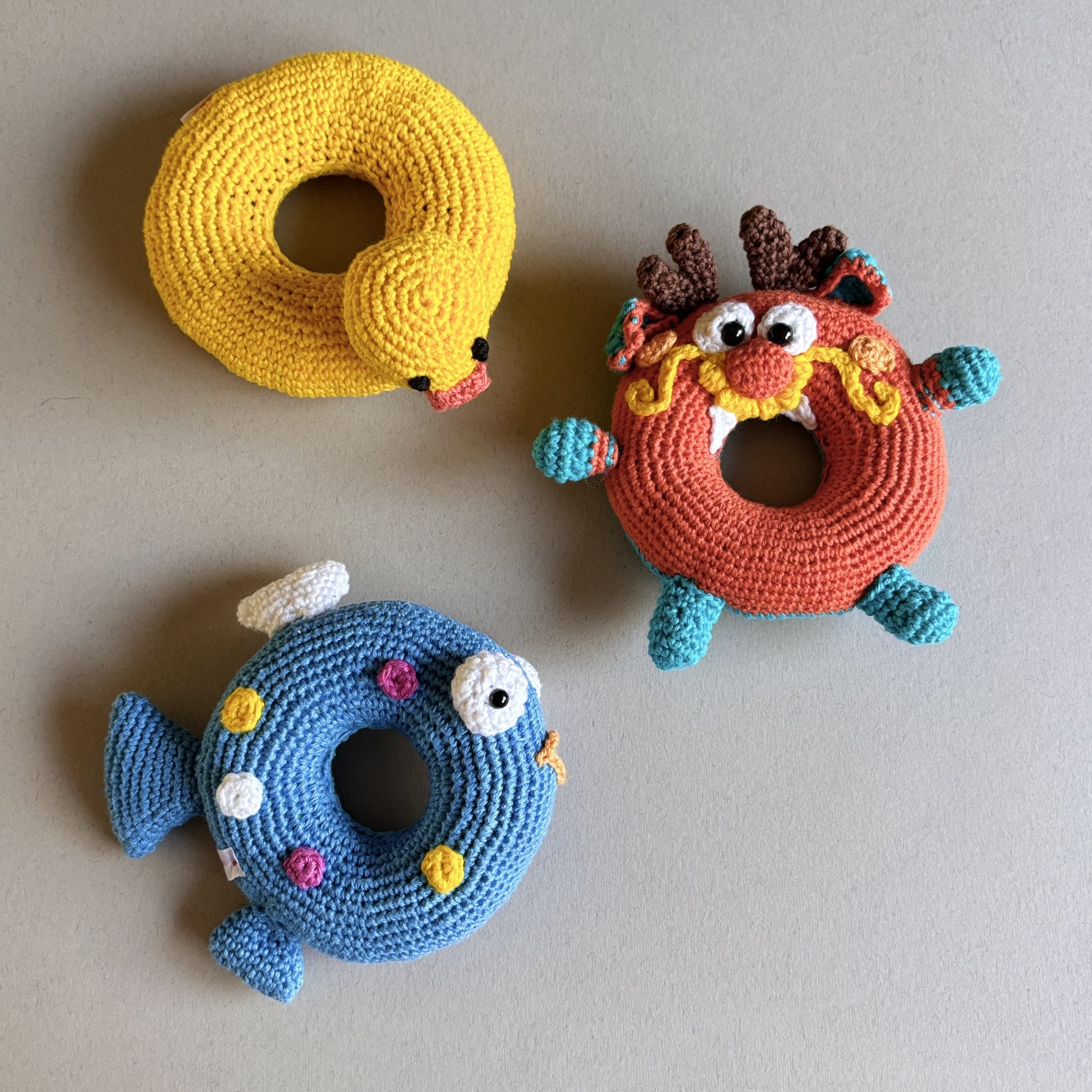 Made using the finest mercerised cotton yarns in vibrant colours to stimulate the baby’s curiosity, fabric filling and safety eyes. Includes rattle inside for sound effects.