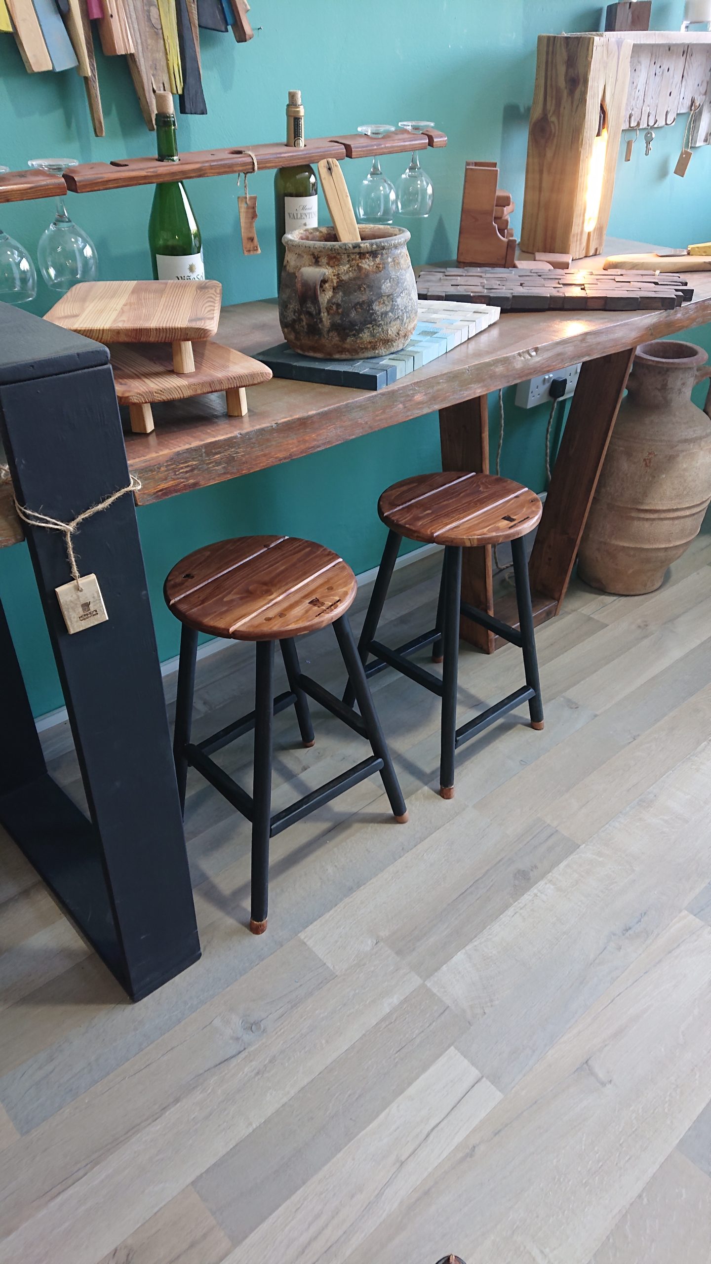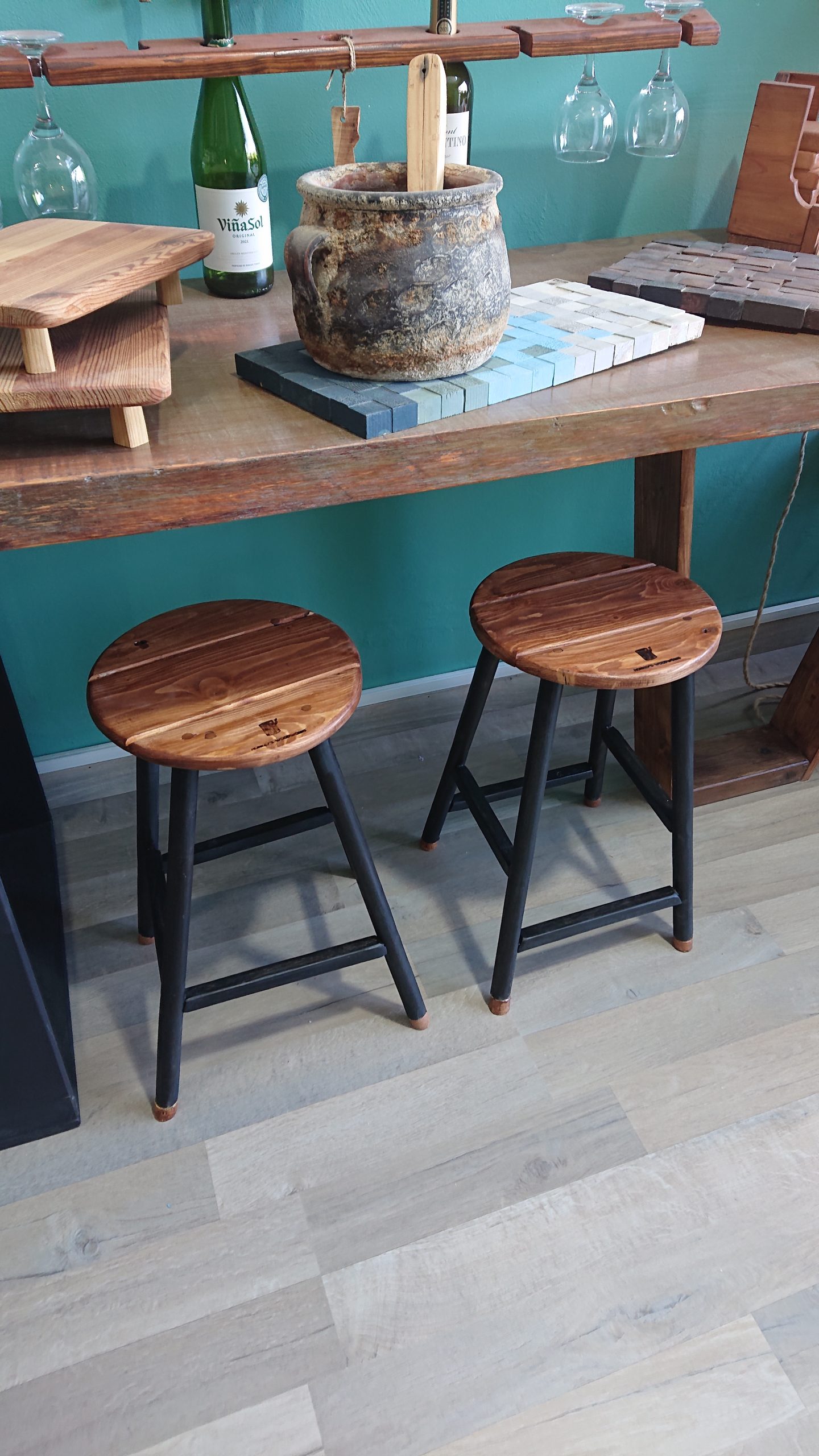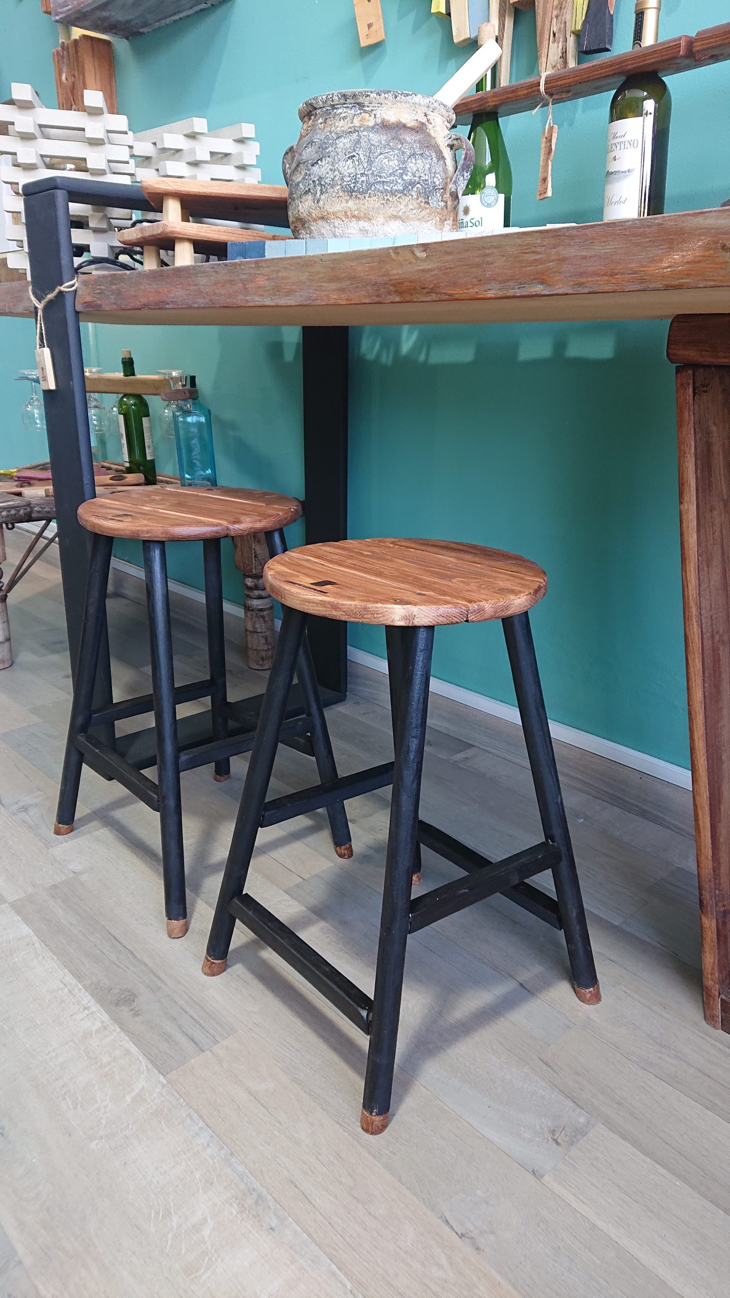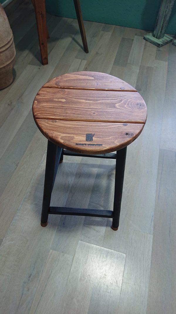 Wood stained round topped stools with mat black legs of pine wood