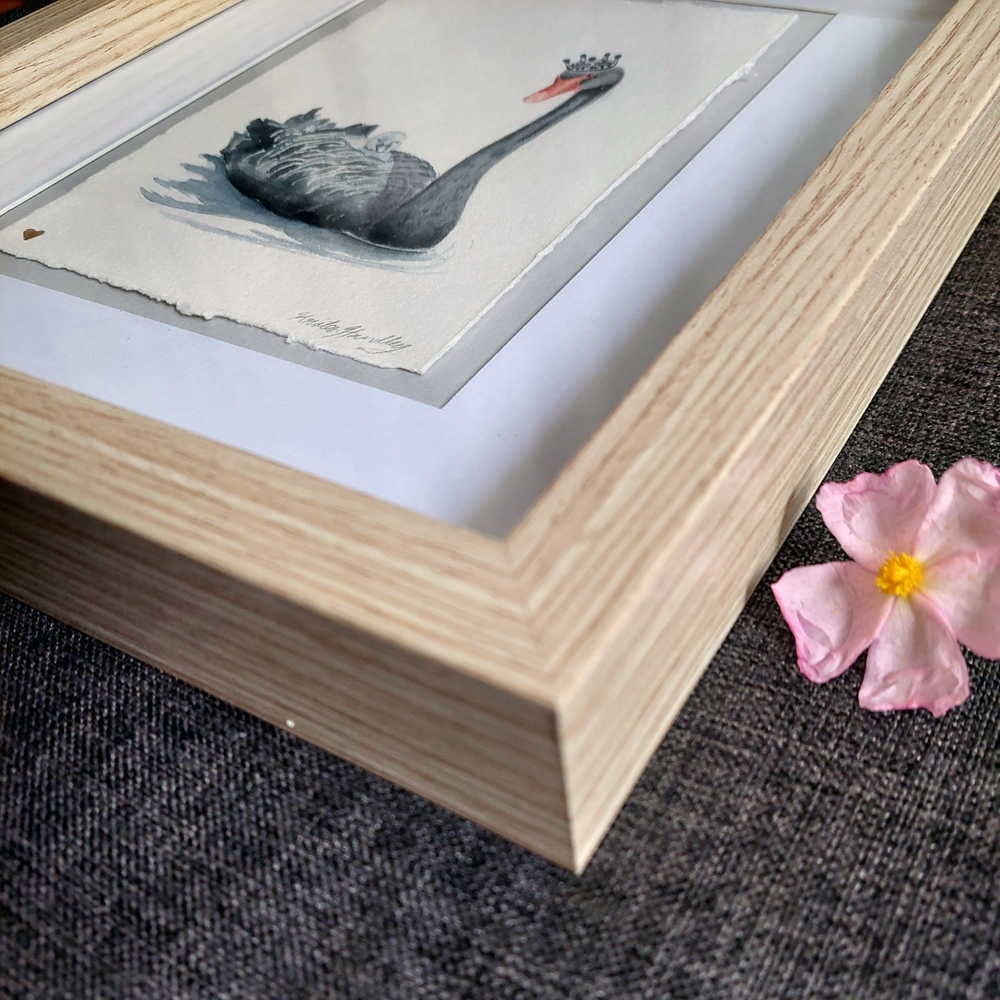 Framed original watercolour painting of a beautiful mother swan wearing an elegant tiara.