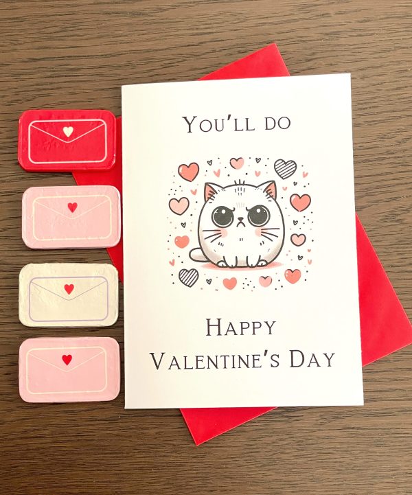 Celebrate Valentine’s Day with a touch of sass and humor! This handmade card features a hilariously grumpy cat with the caption “You’ll Do, Happy Valentine’s Day.” Perfect for someone who appreciates a bit of sarcasm and loves cats, this card is sure to bring a smile (even if the cat wouldn’t).