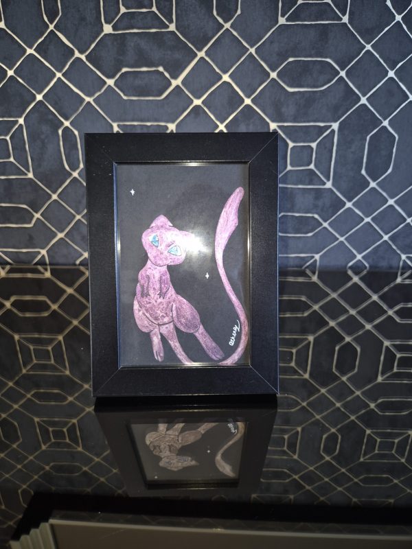 Dark Mew, which is the Pokémon illustrated in the foreground of this framed artwork, is painted with pearlescent or iridescent watercolour, making it shine as it reflects light beautifully. The artwork comes framed, as you can see in the pictures, with a black wooden frame. Some of the photos were taken using flash to show the artwork’s shiny property. The main focus is given to the Pokémon; therefore, I wanted to keep the background extremely minimalistic, in this case completely black. . The background perfectly complements the Pokémon’s colours in every case. The balance between the subject and background creates an overall harmonious feel.
