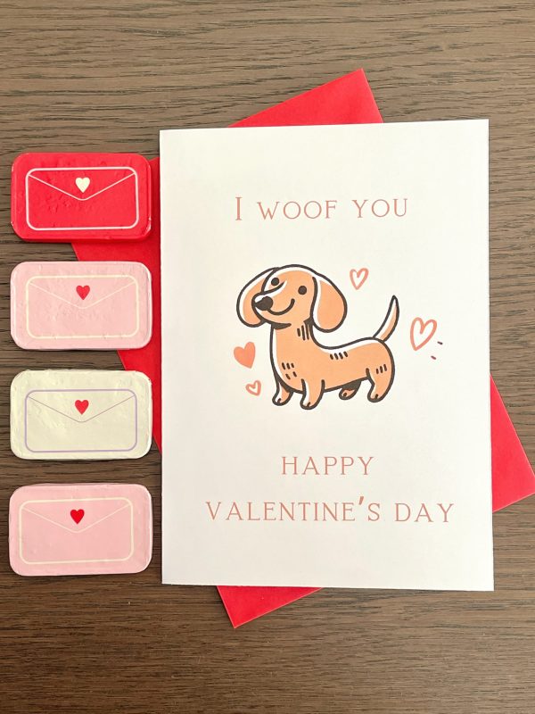 - Front Design: Cute dog illustration with the caption “I Woof You, Happy Valentine’s Day”