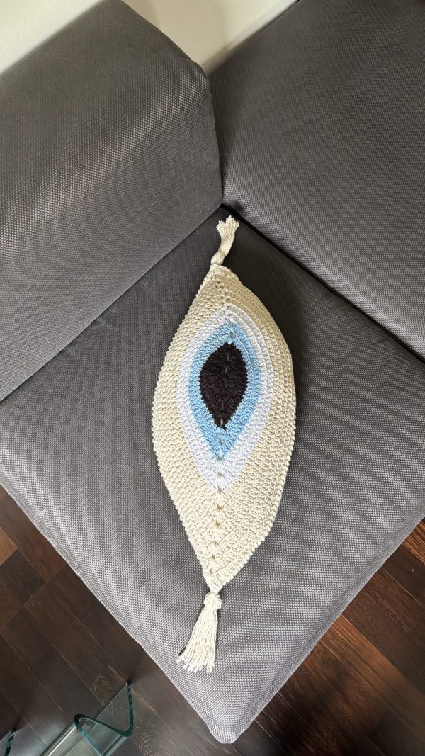 This handmade crochet evil eye cushion is a modern take on a timeless symbol of protection. Shaped like an eye and crafted in a calming palette of soft pale blue, white, beige, and a subtle touch of black for the iris, this oblong cushion adds a stylish detail to any space.