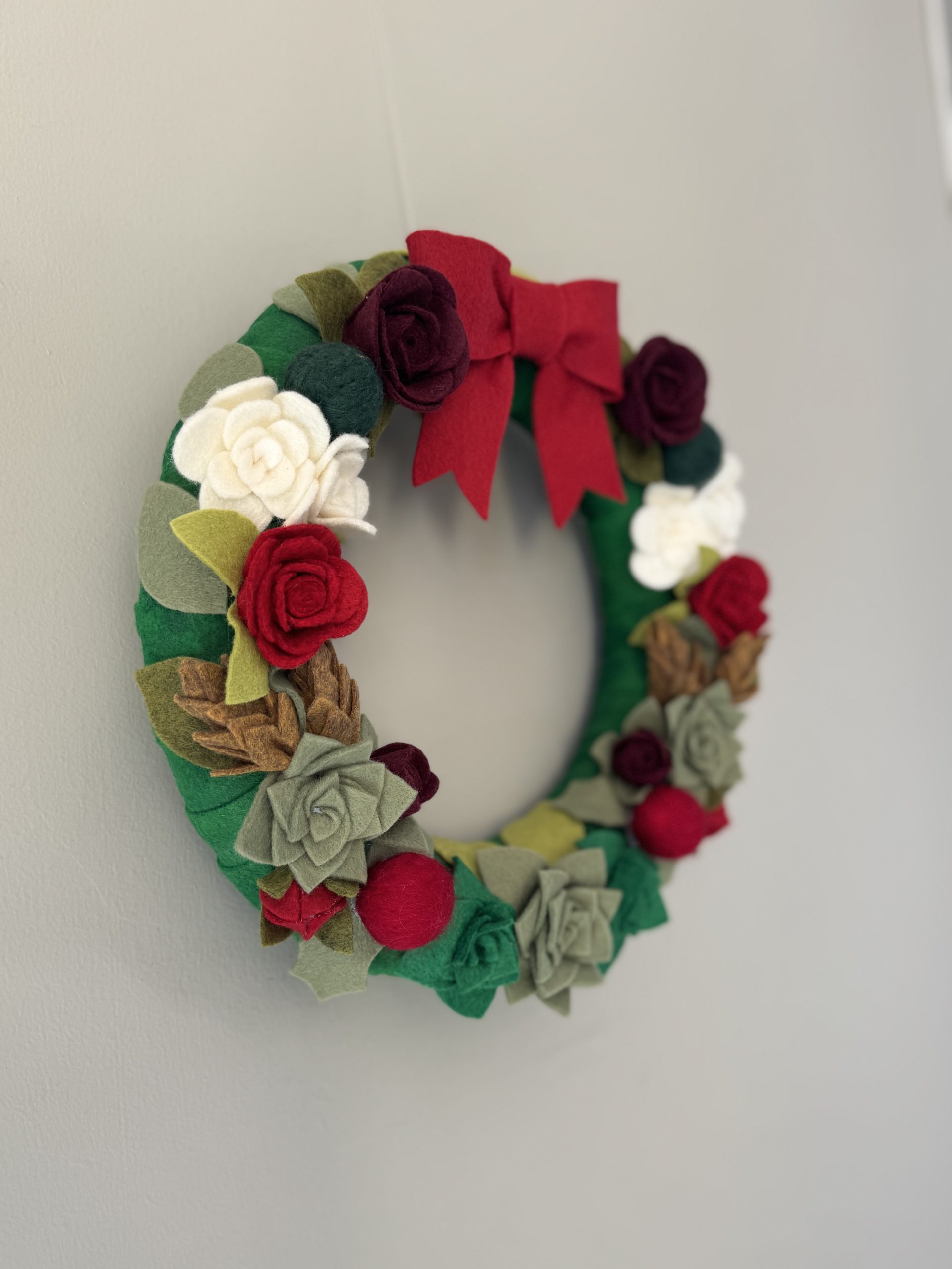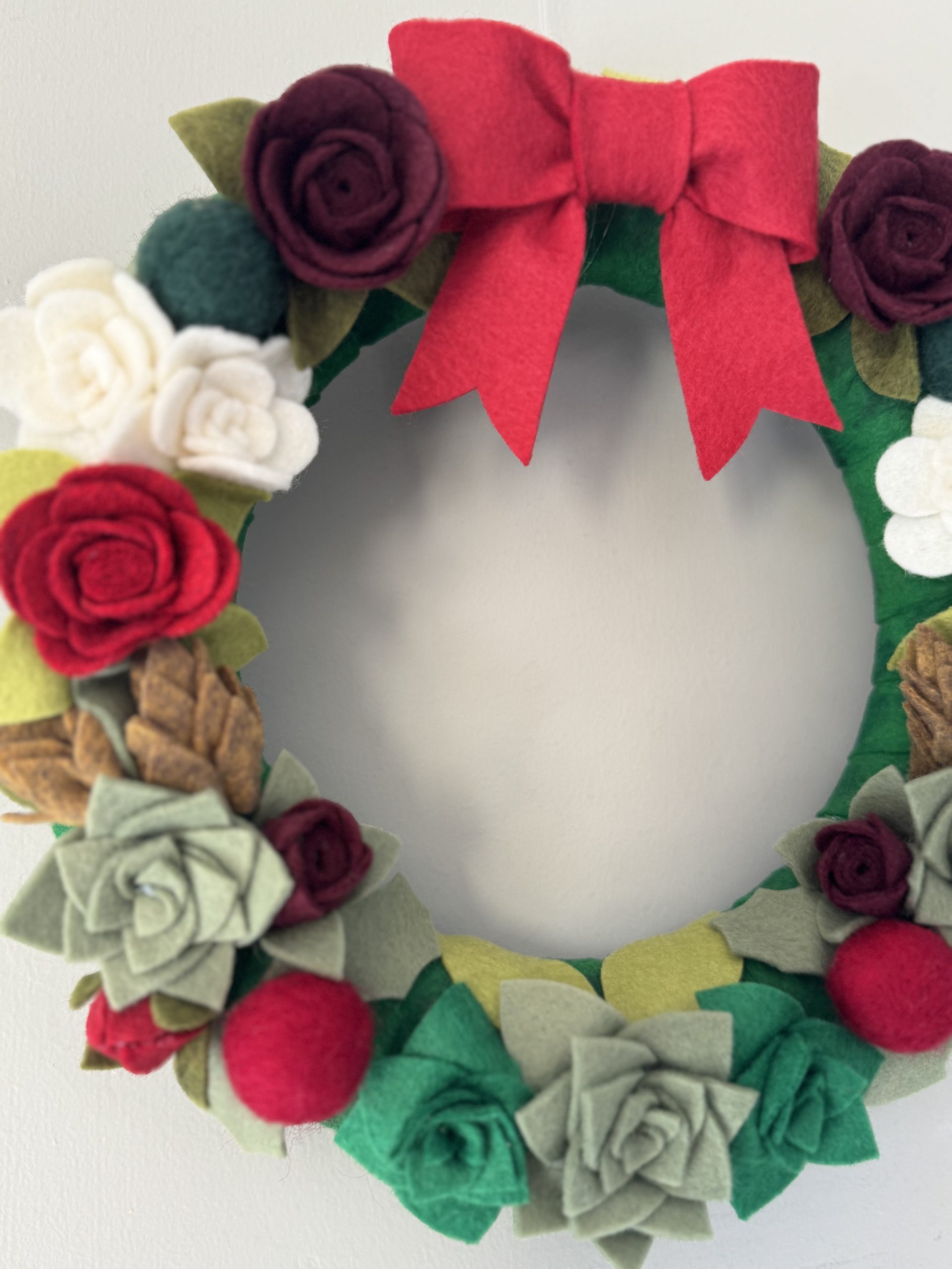 Festive Felt Winter Wreath handcrafted with felt, featuring leaves, flowers, pinecones and holly.