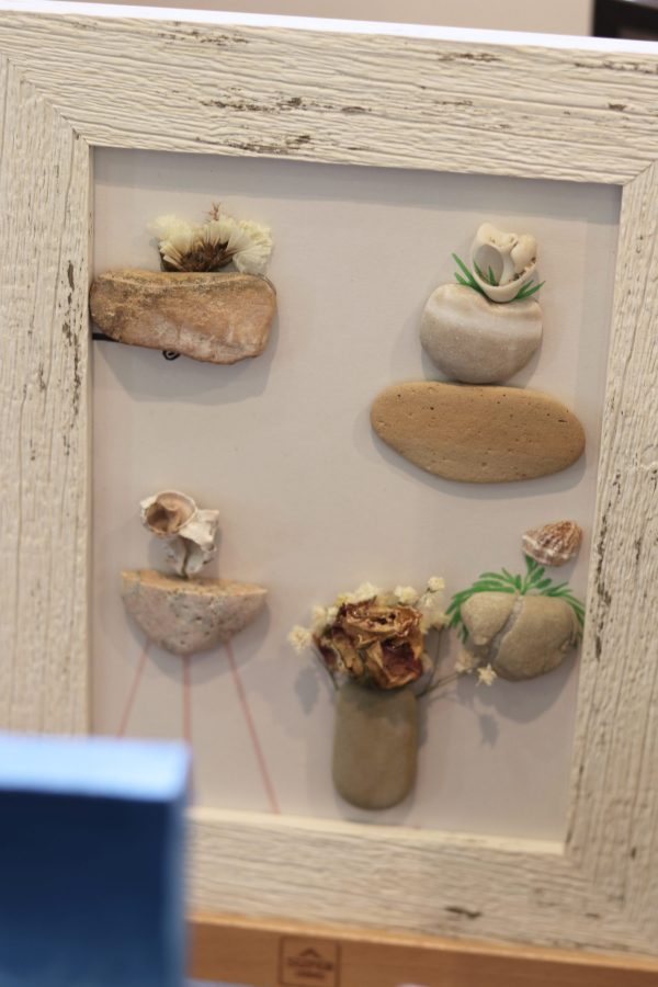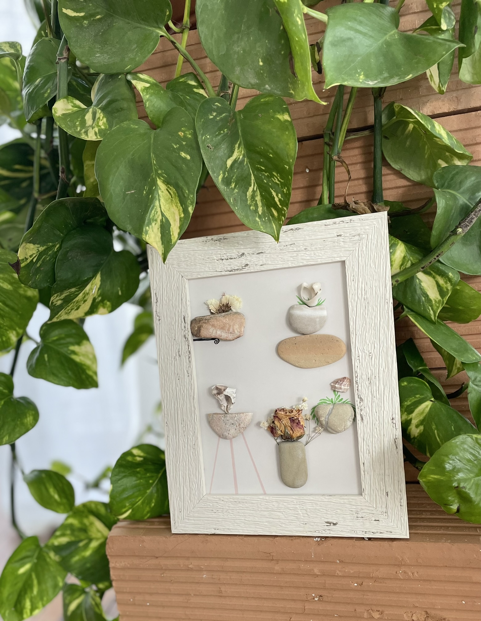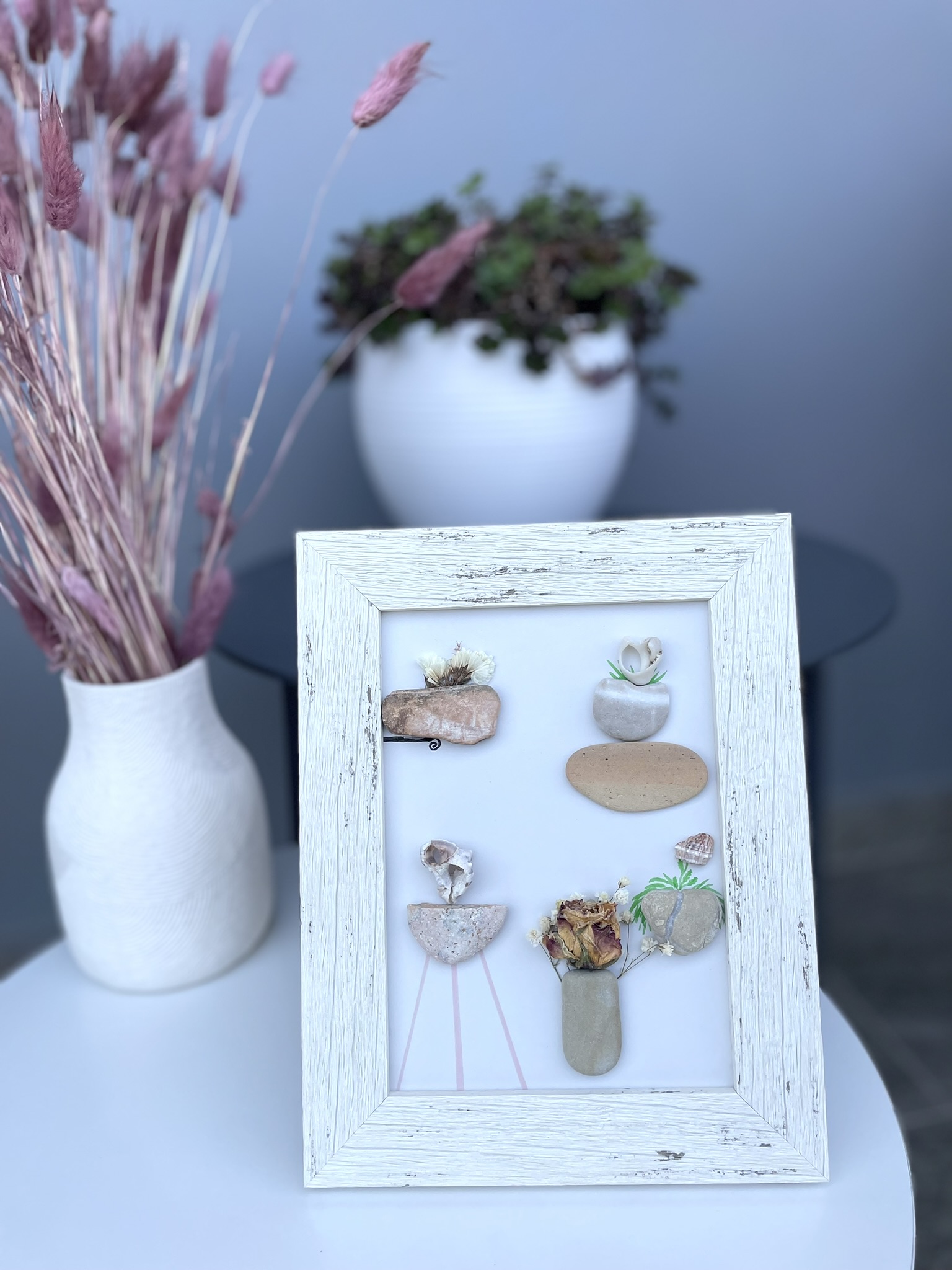 This work was made of naturally beautiful and carefully selected beach stones, accompanied by real flowers, dried and preserved. They will not loose their petals or experience a colour fading.