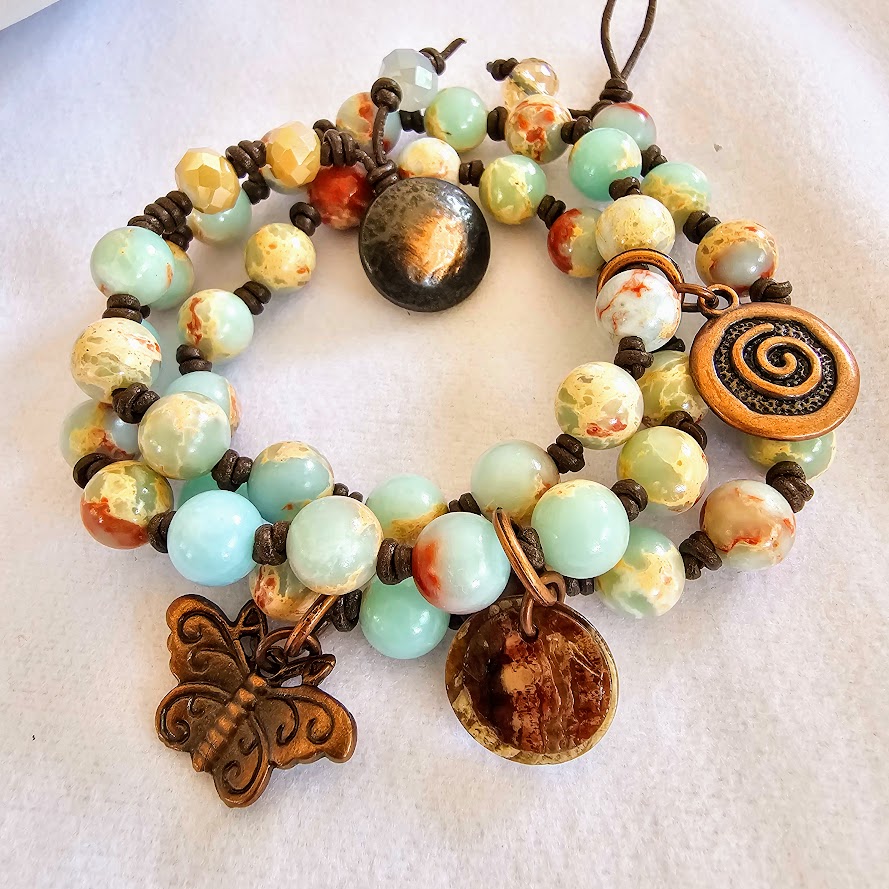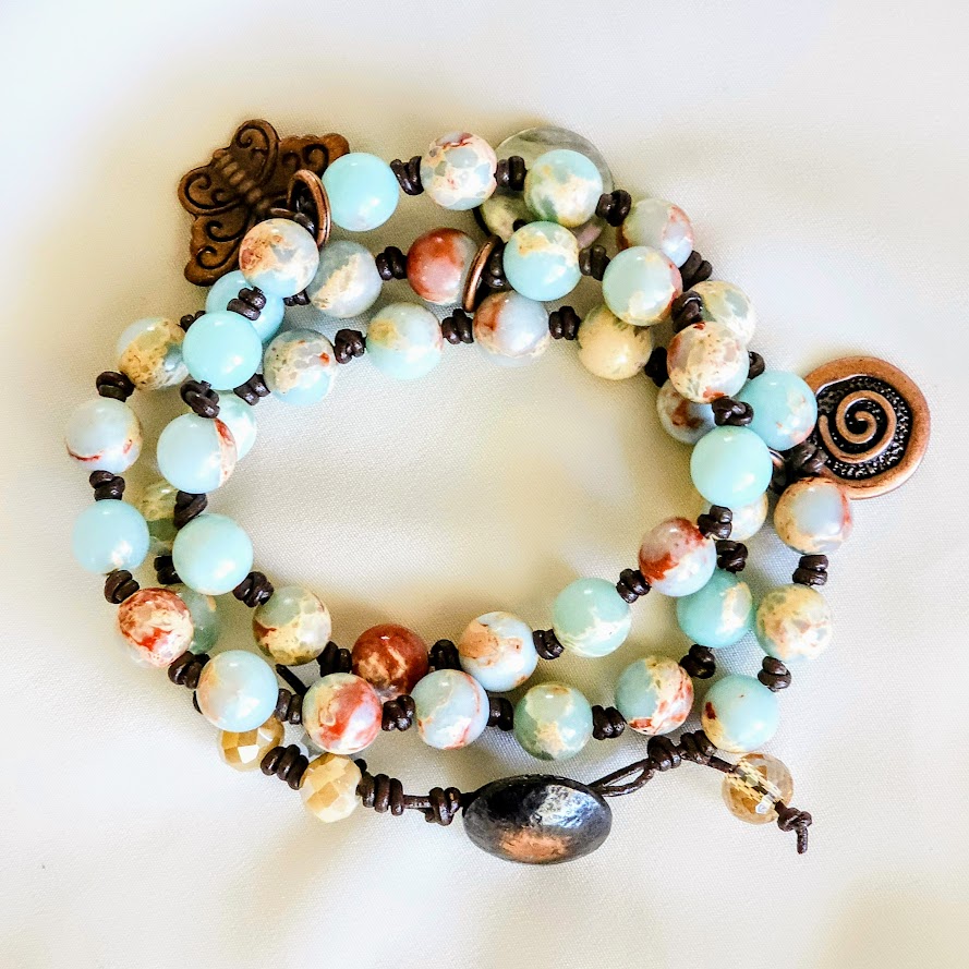 This piece is made with natural sediment jasper gemstone beads, with a beautiful palette of colors varying from brown, honey and pale blue. The natural leather knots add an organic look, and the copper charms give a sense of lightness and movement. The closure is a simple button.