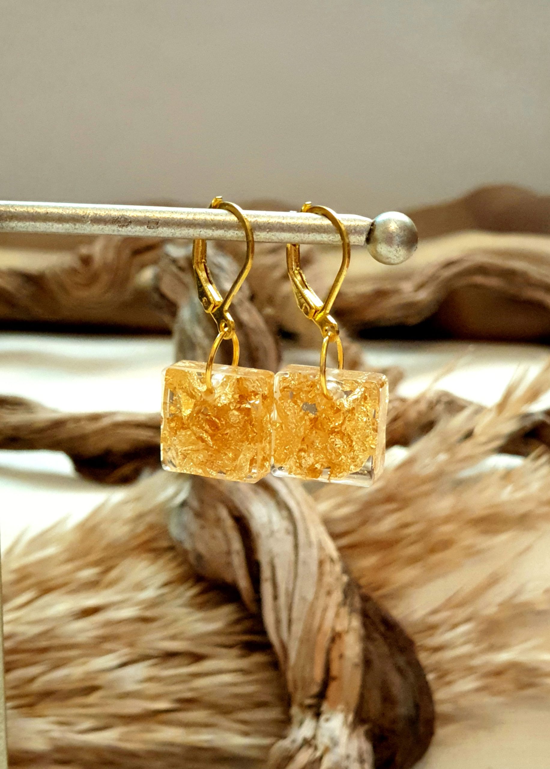 Made with epoxy resin, golden leaves, and earring clips