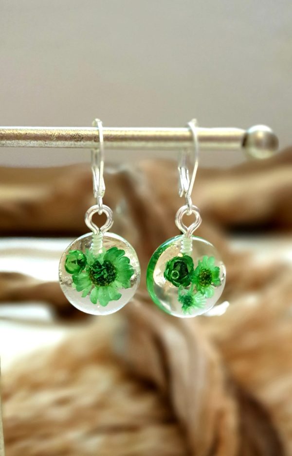 Made with epoxy resin, decorative flowers, and earring clips