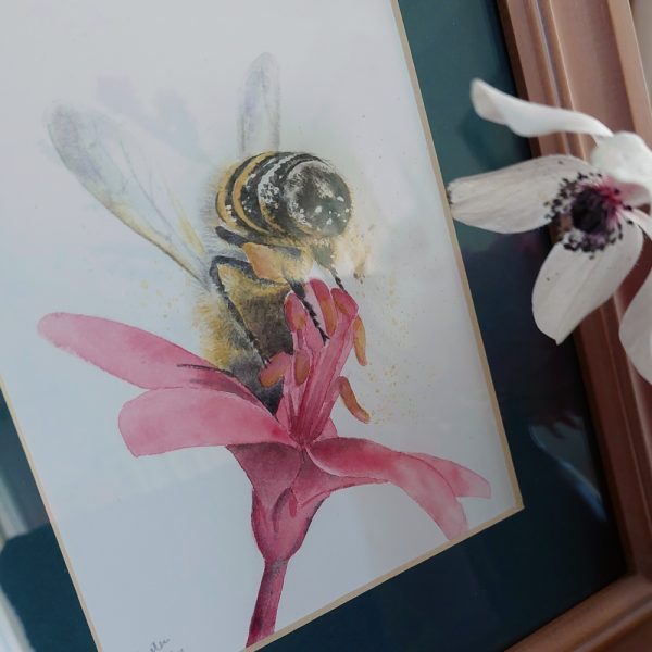 “Bottoms Up” – Original watercolour painting of a honeybee buried deep inside a spring flower collecting pollen