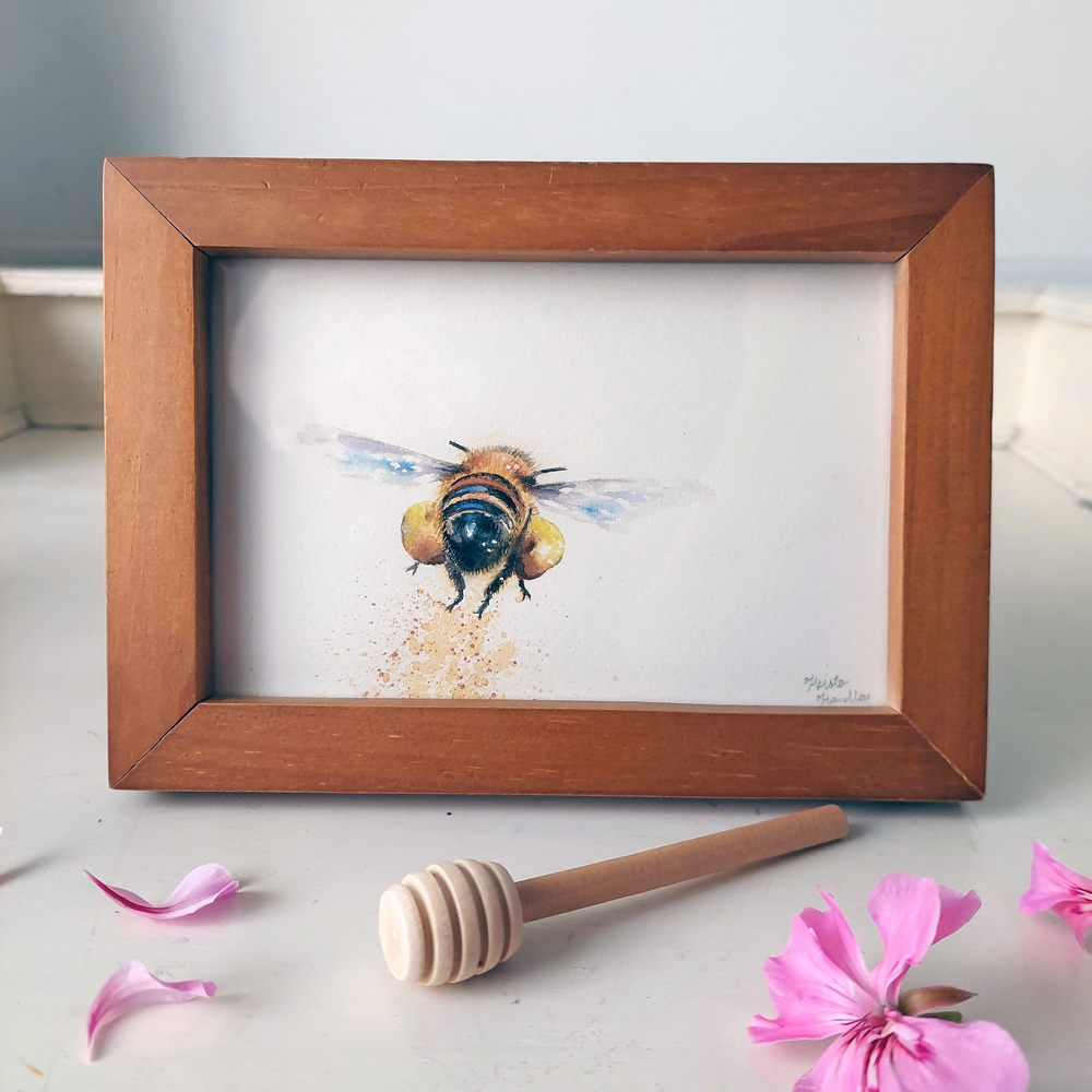 Celebrate the magic of gardens, honey, and bees with my hand-painted original watercolour. This captivating piece showcases a busy honeybee, buzzing off into the distance with ultra-large pollen sacks. Set behind glass in a solid, rustic honey-coloured wood frame, this artwork is simple, sophisticated, and precious—just like our bees. Intricately painted with care and detail showcasing a splash of pollen dust. What a load!