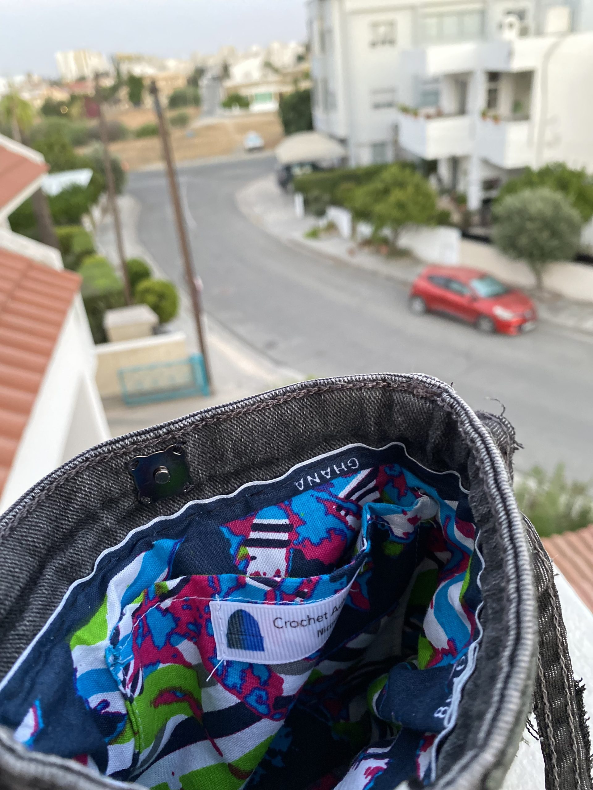 This is a really unique bag made of old jeans. Firstly I cut jeans into strips, then sewed them to yarn and crocheted this one-of-a-kind bag.