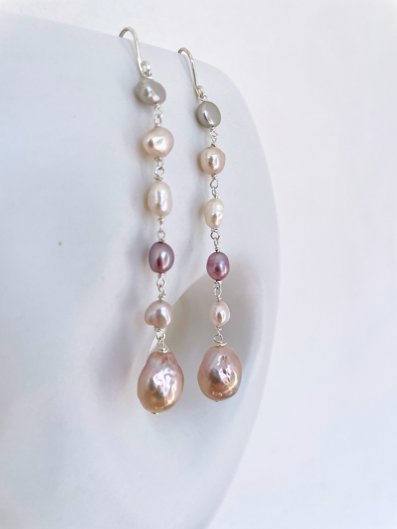 These enchanting handmade earrings feature six stunning freshwater pearls, artfully arranged in a beautiful cascading design. Each earring boasts multicolor pearls in soft hues of pink, purple, light blue, and white, adding a subtle yet colorful touch to any outfit. Set in sterling silver, these delicate earrings are perfect for any occasion, from casual outings to special events.