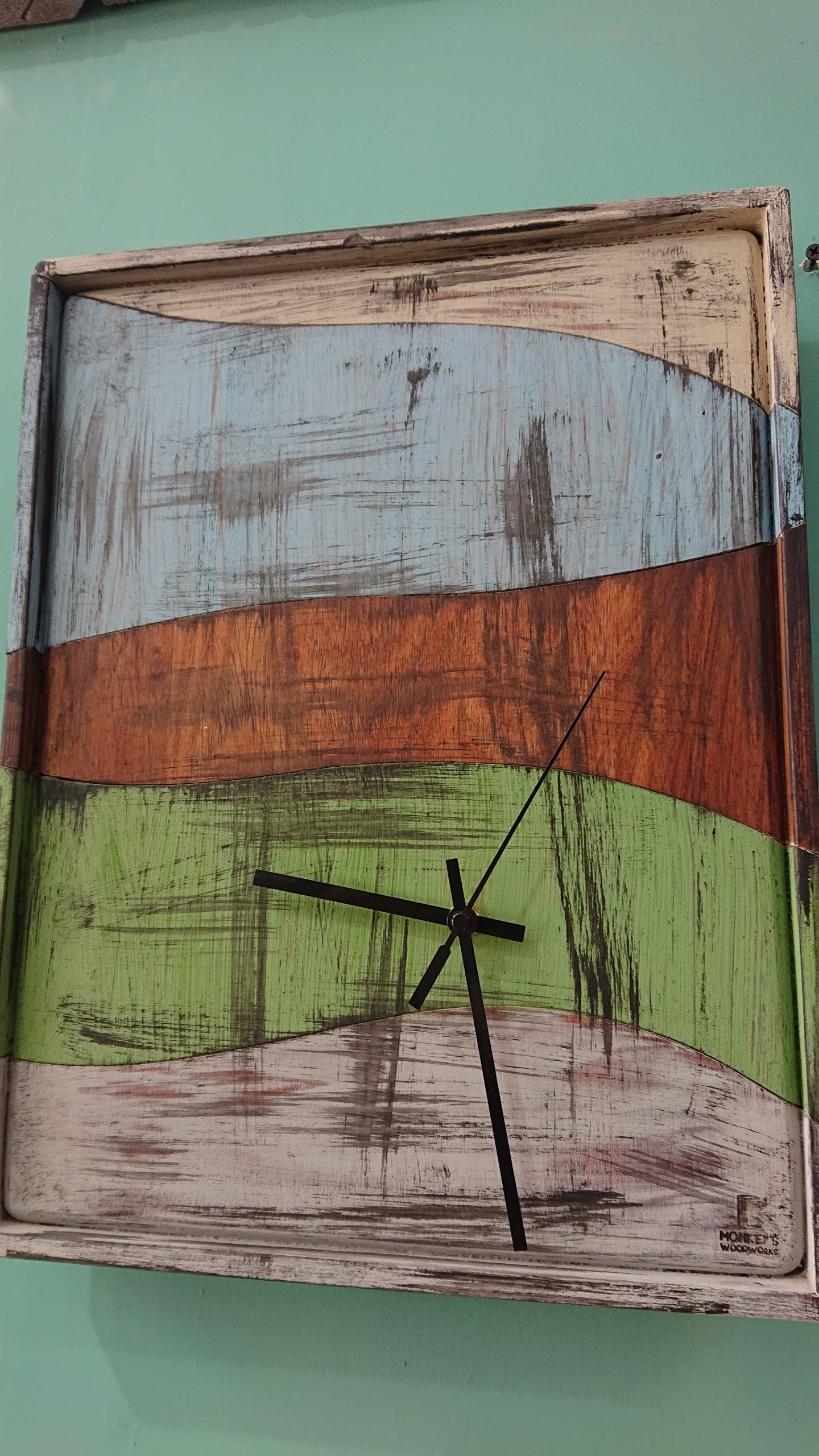 Multi-piece hardwood wall clock constructed from reclaimed and repurposed wood from a dismantled kitchen. Handmade clock with smooth movement mechanism. Finished with chalk paint in various colours and tones to make for a very authentic look to add a splash of colour to any home, pool hall, games room, office space