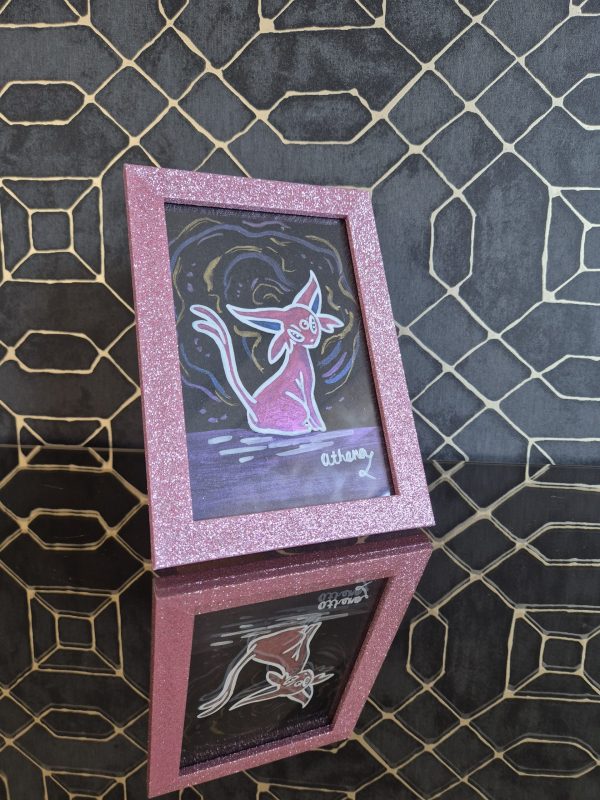This is a one-of-a-kind artwork, inspired by the Pokémon Anime Series. The Pokémon in the foreground is painted with pearlescent or iridescent watercolour, making it shine, as it reflects light. It comes framed, as you can see in the pictures. Some of the photos were taken using flash, to show the artwork’s shiny property.