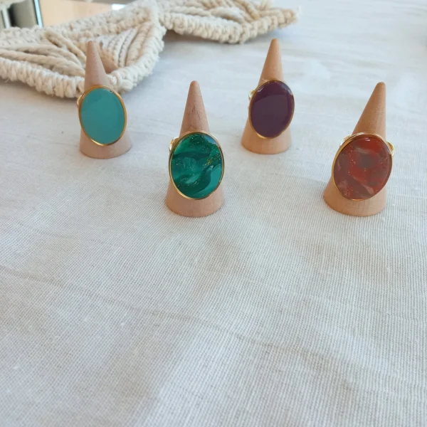 Materials: polymer clay, resin coating, stainless steel ring base (adjustable size).