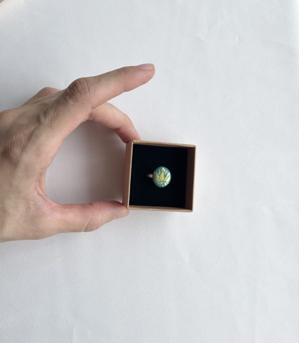 It’s turquoise color clear background is in perfect harmony with the golden lotus flower pattern, which adds to this jewelry piece a sophisticated and unique look. It symbolizes mindfulness and peace.