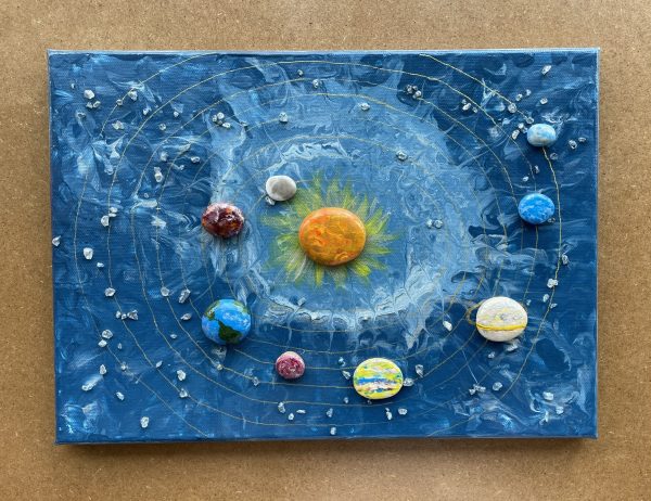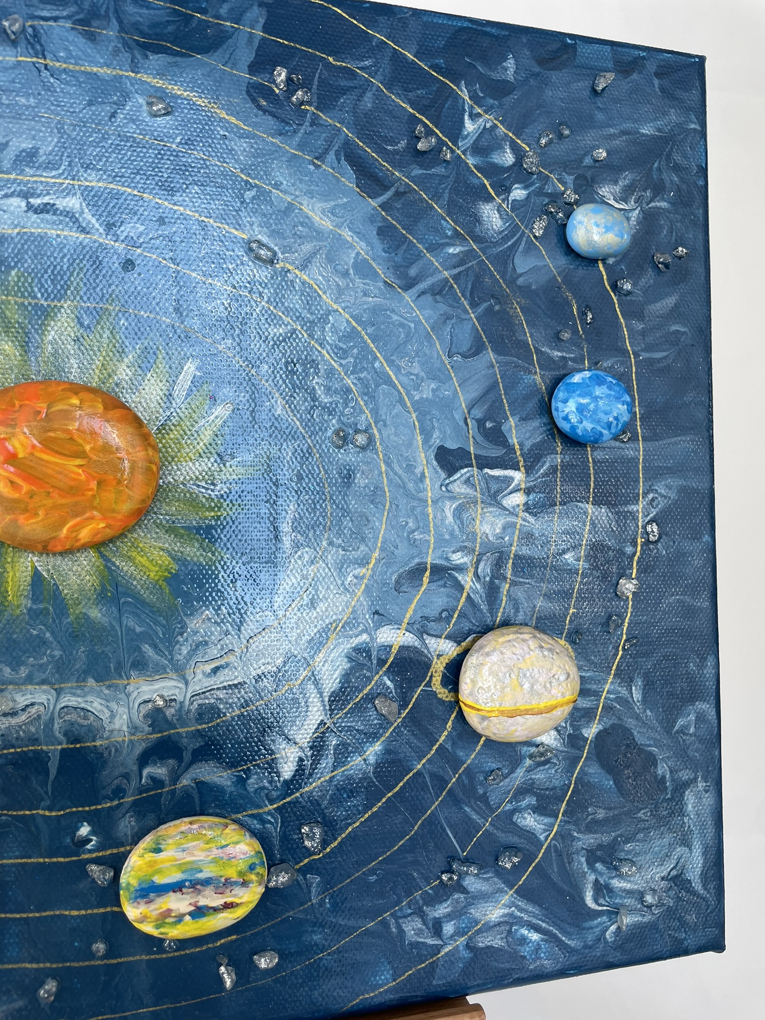 Hand poured acrylics on canvas made the base of this artwork, then so many details followed to complete this piece. Detailed work executed as mixed media, completed by the addition of pebbles as planet.