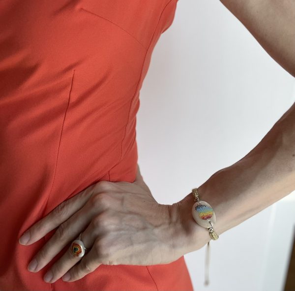 This ring is colourful and would add freshness to your look. It is a handmade work.