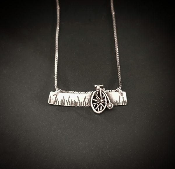 Unique pendant with penny farthing bicycle in a silver textured bar, paired with a sterling silver box chain.