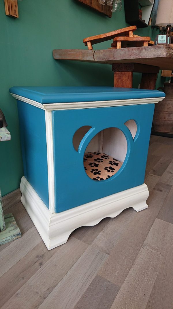 This beautifully constructed piece of furniture started life as a bedside set of drawers that I completely stripped back to it’s rich dark wood and given a very unique retro look with vintage blue with white details. A custom made, fitted cushion with super soft blanket cover lines the interior space for ultimate comfort.