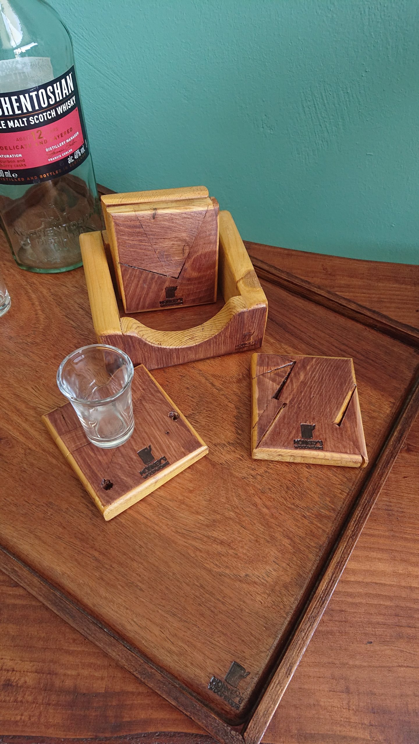 This set of four handmade high-quality multi-wood coasters with holder offer a unique but simple and classy design would suit any home, bar, restaurant or man cave.