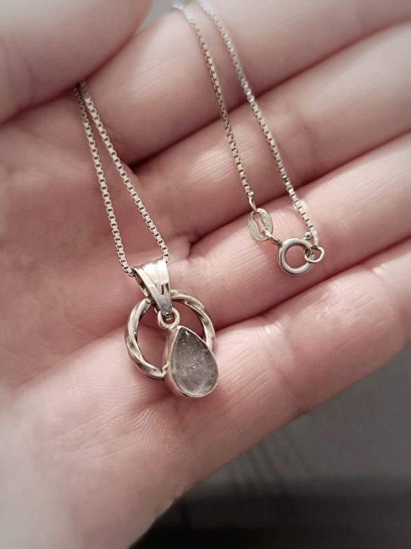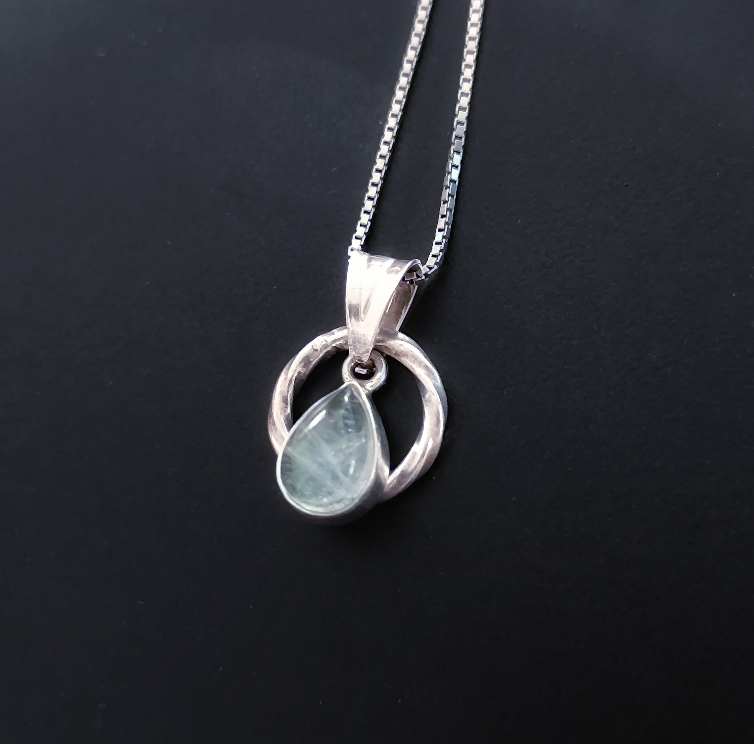 A unique silver tear with apatite stone and an twisted silver circle moving independently