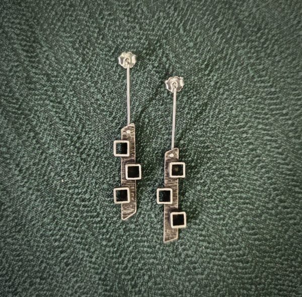 Sterling silver oxidized earrings. Unique texture with squares , hammered by hand , oxidized to create the perfect finish for a one of the kind pair of earrings. A playfull design with a nice movement. Wear them all day long and create a sophisticated look.