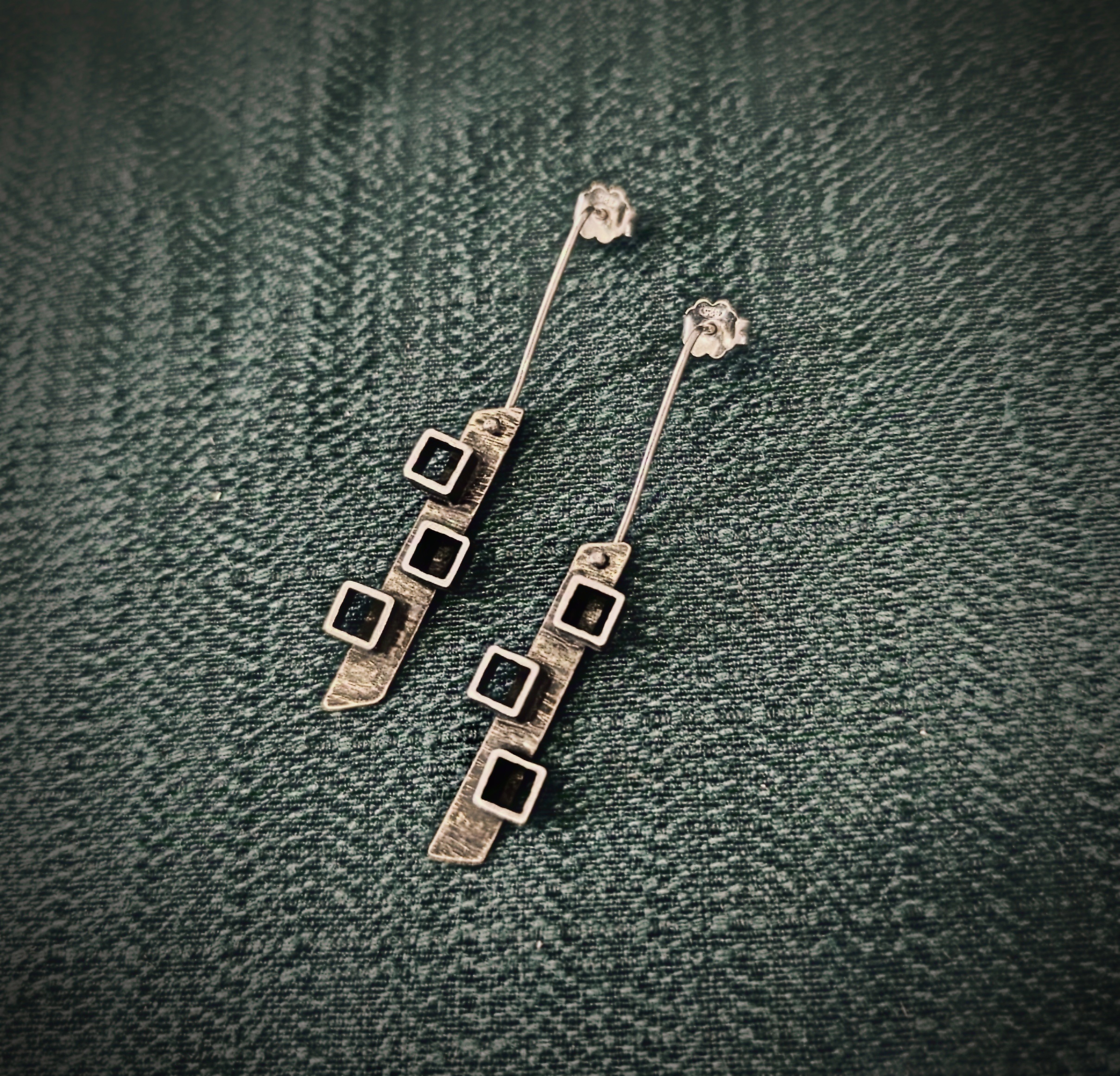 Unique silver earrings textured and oxidized with squares from the geometric collection.