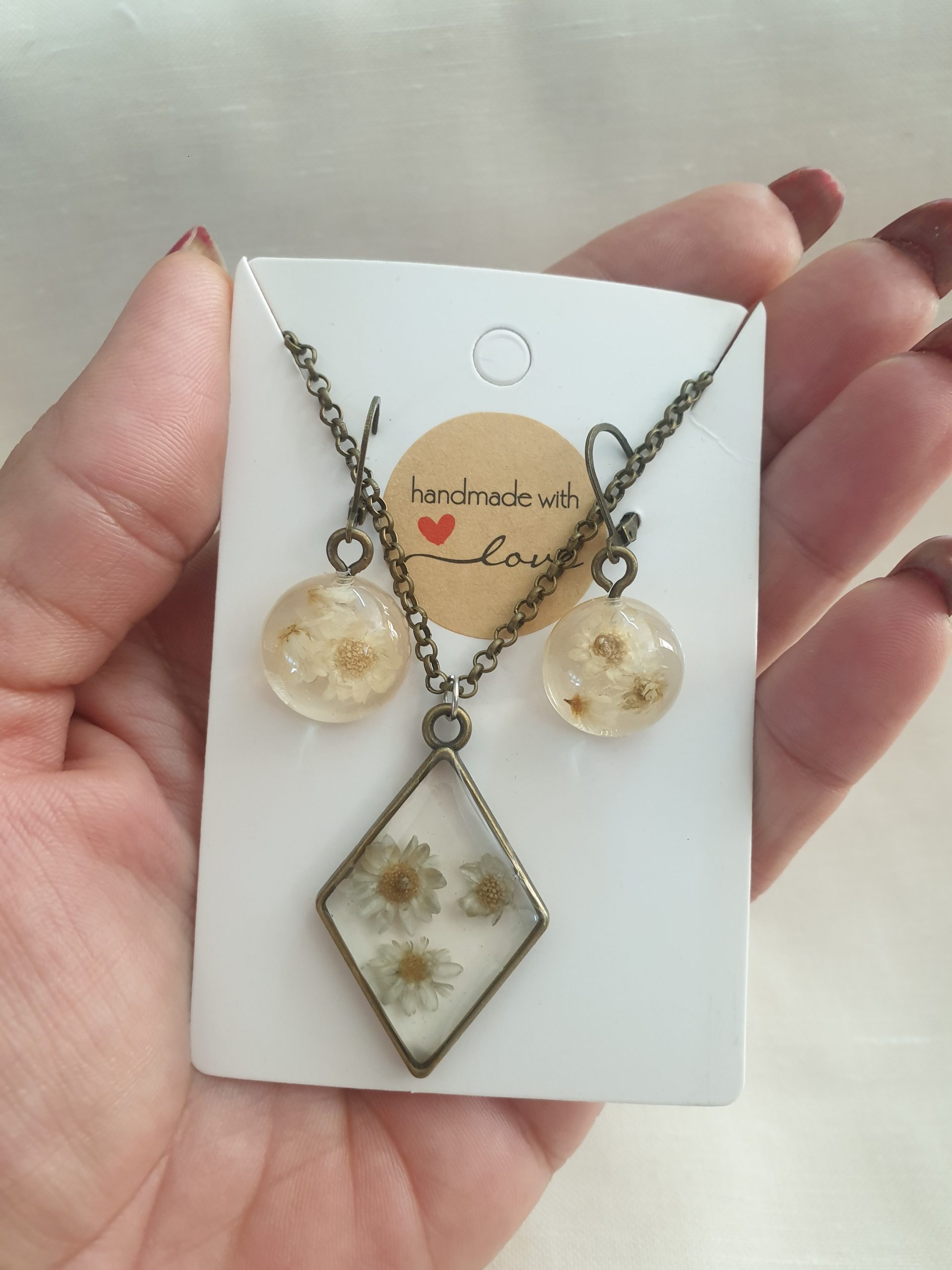 Made with epoxy resin, decorative flowers, stainless steel frame, chain and earring clips