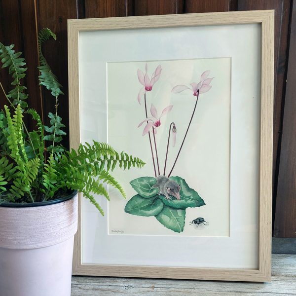 Discover the beauty of nature with this delicate hand-painted botanical illustration featuring the Cyprus cyclamen, a tiny shrew, and an endemic beetle, all set in a light oak-coloured frame. The natural, soft earthy tones complement a wide range of interior design styles, making it a versatile addition to any space.