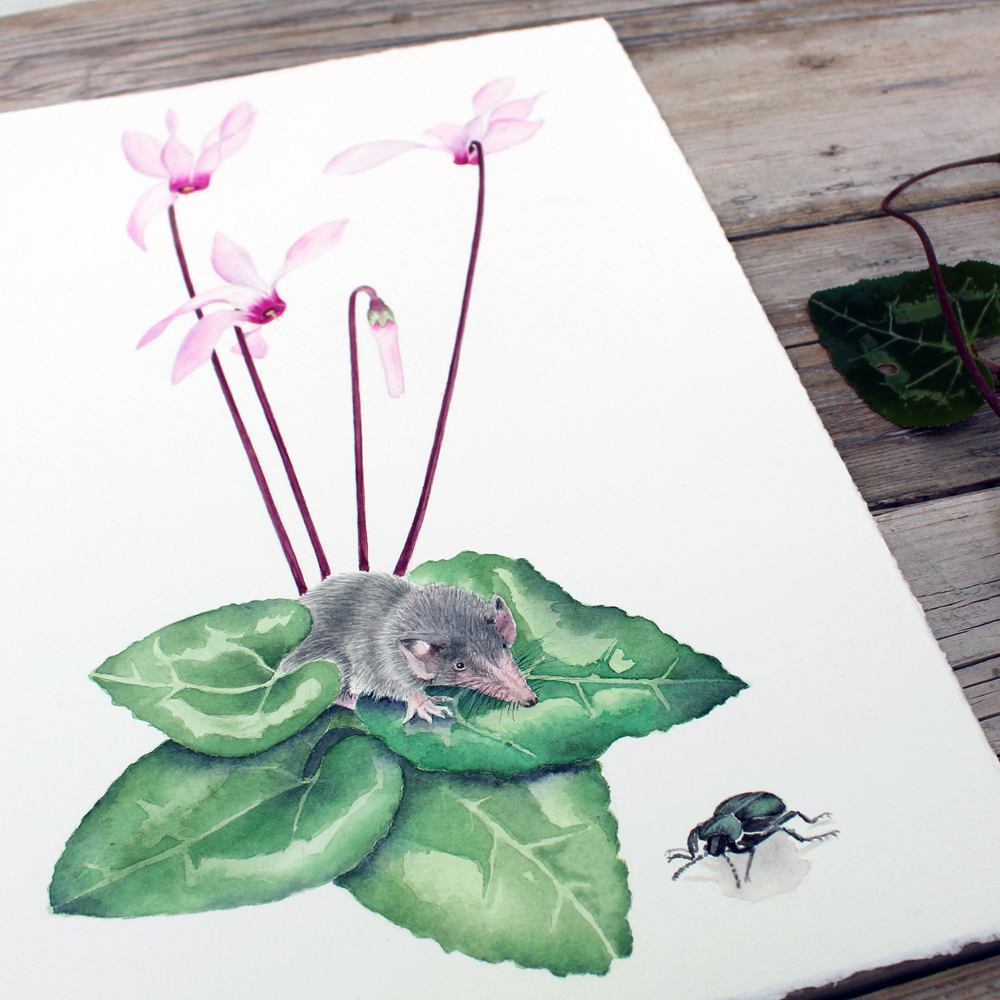 Delicate Hand-Painted Botanical Illustration: Cyprus Cyclamen, Shrew, and Endemic Beetle