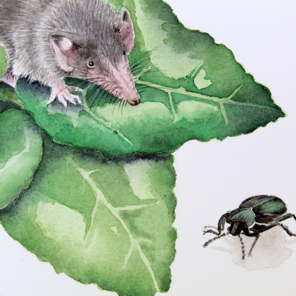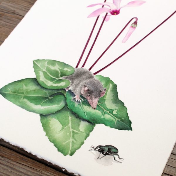 Witness the charm of the Cyprus cyclamen as it peeks through the earth in autumn. After a long, hot, and dry summer, these pale pink, fragrant flowers and heart-shaped leaves never fail to bloom, creating a sophisticated and beautiful plant. This painting captures its natural beauty, with a cheeky shrew adding curiosity and an endemic beetle adding a touch of wonder.