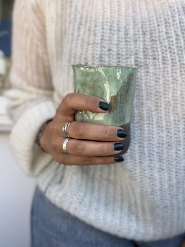 Glasses are made of high temperature clay with chamotte of four colors with different glazes. The glasses have a crumpled shape for a comfortable grip with your fingers. They can be used as glass, cup or small vase for flowers.